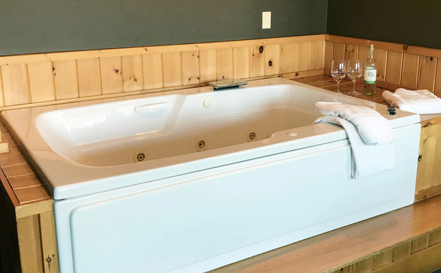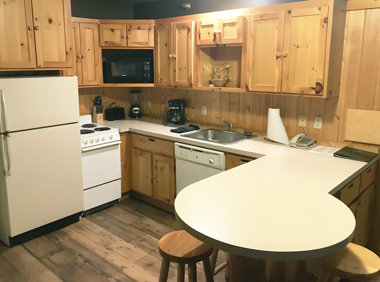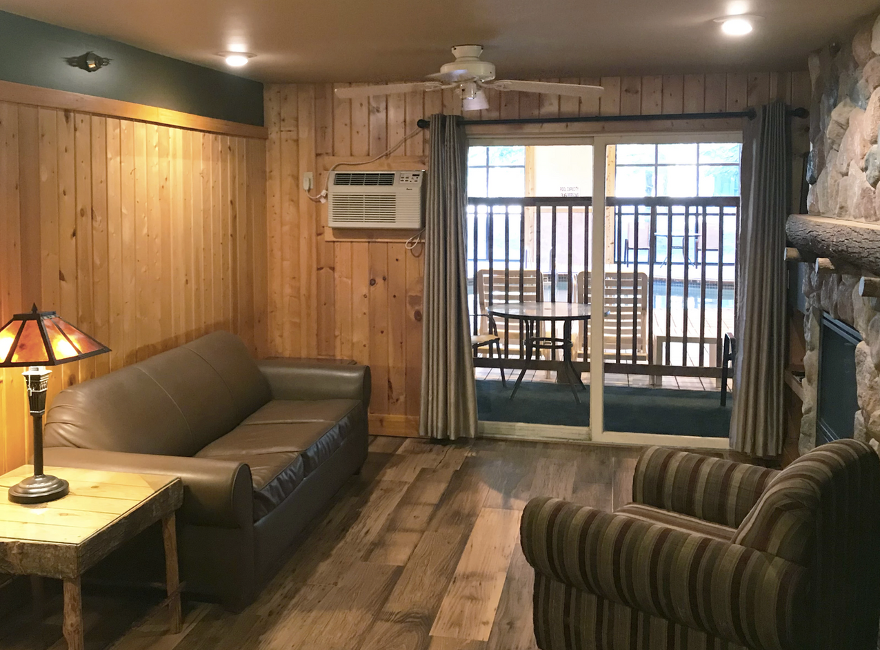 This spacious suite at the Main Lodge offers a King bed in the bedroom, a full living area, a kitchen, and private balcony. Enjoy varying views of the Northwoods, creek, and nearby state park. The suite is also enhanced with a cozy fireplace and a relaxing whirlpool spa.